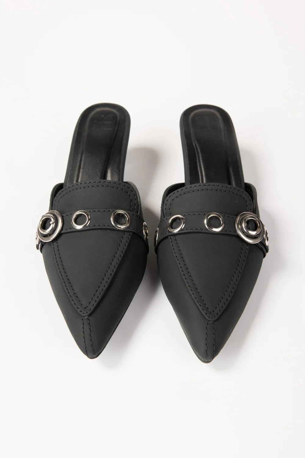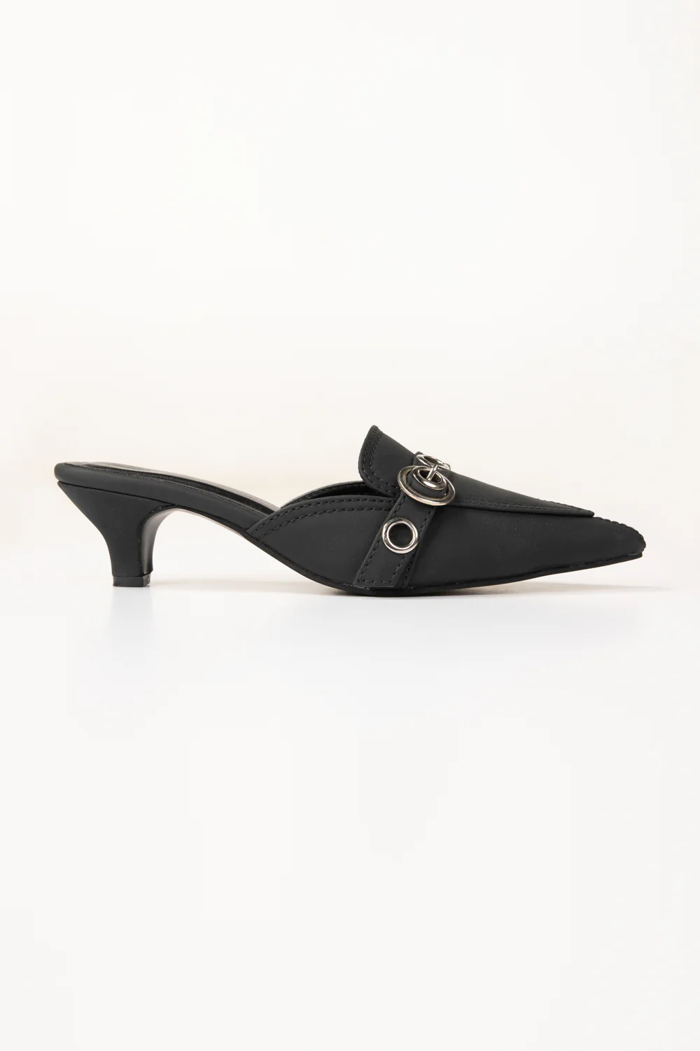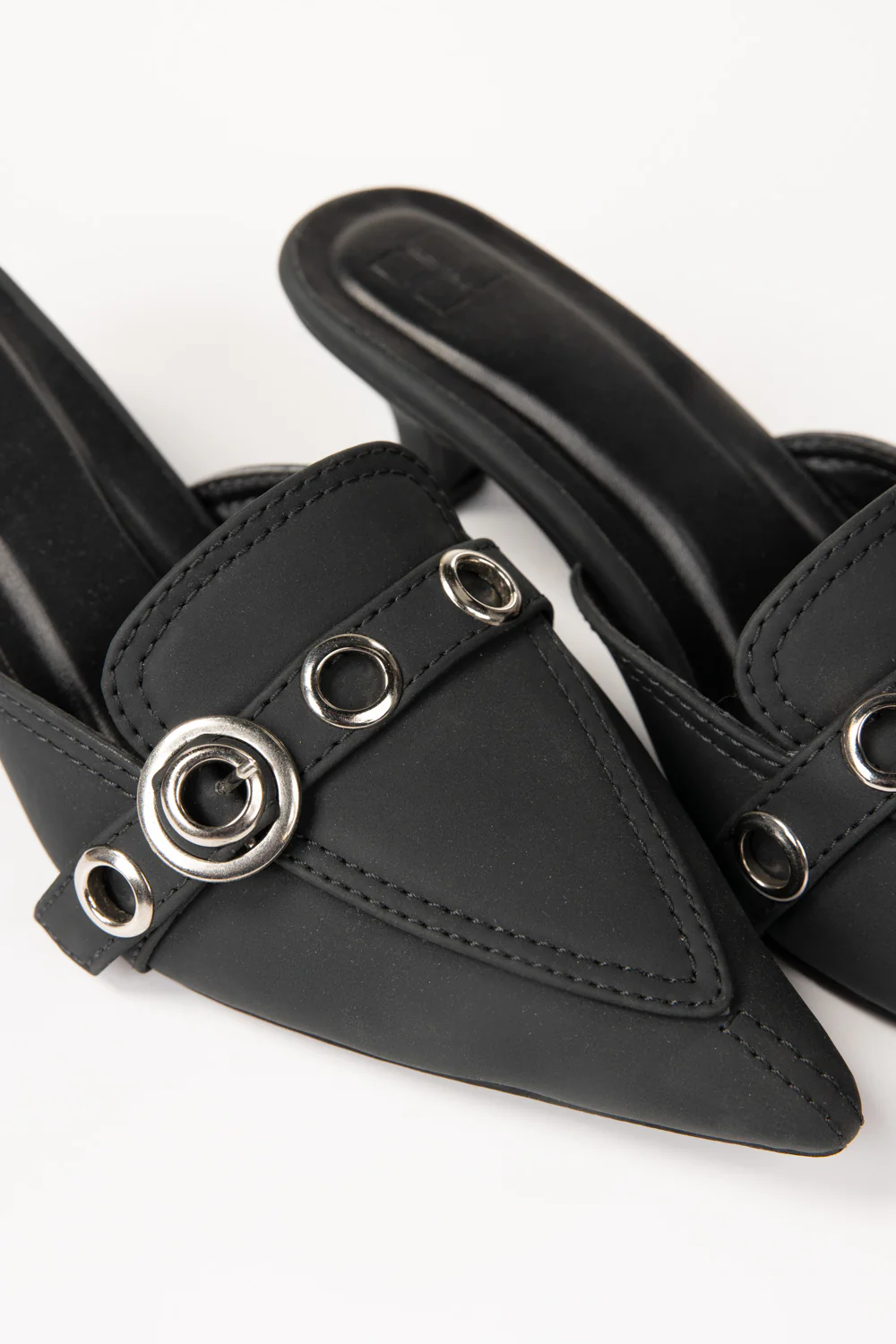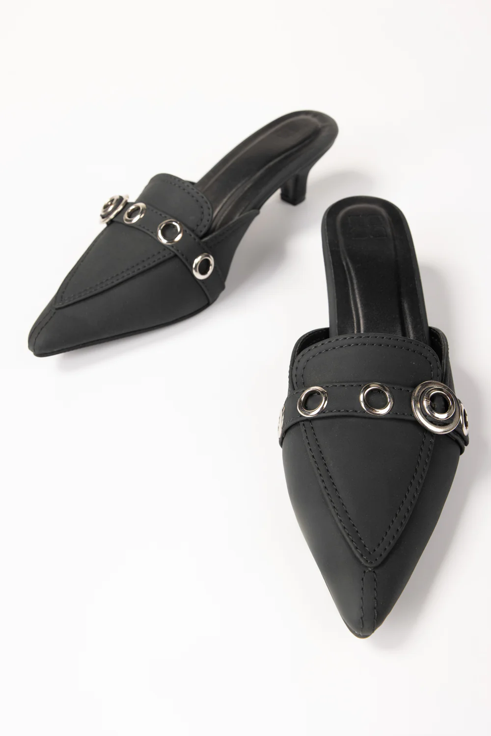 & Free ShippingStep into effortless elegance with these black pointed-toe mules, featuring a low kitten heel for all-day comfort. Adorned with silver-tone eyelet detailing and a statement buckle, they add a touch of chic to any outfit. Perfect for both work and casual outings.