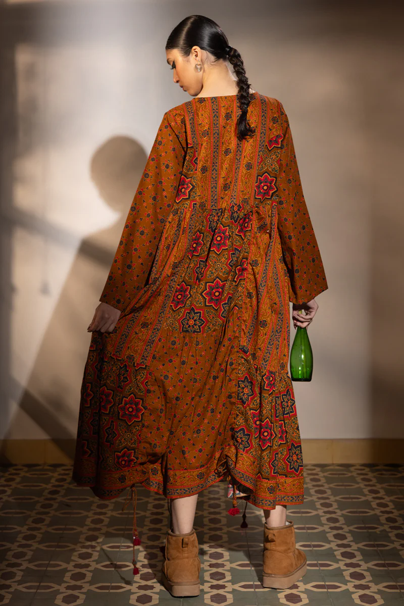 & Free ShippingLong tiered printed dress with a round neckline and a keyhole slit, finished with tassel detailing along the sides for an artisanal touch. Soft gathers add graceful volume to the silhouette.